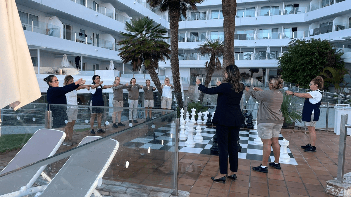 Cada mañana, antes de comenzar la jornada, acompaña al equipo de pisos a un lugar especial del hotel, o junto a la playa. Allí, con la brisa del mar y un maravilloso amanecer, comparten unos minutos de estiramientos y preparación física para empezar el día con energía y bienestar.